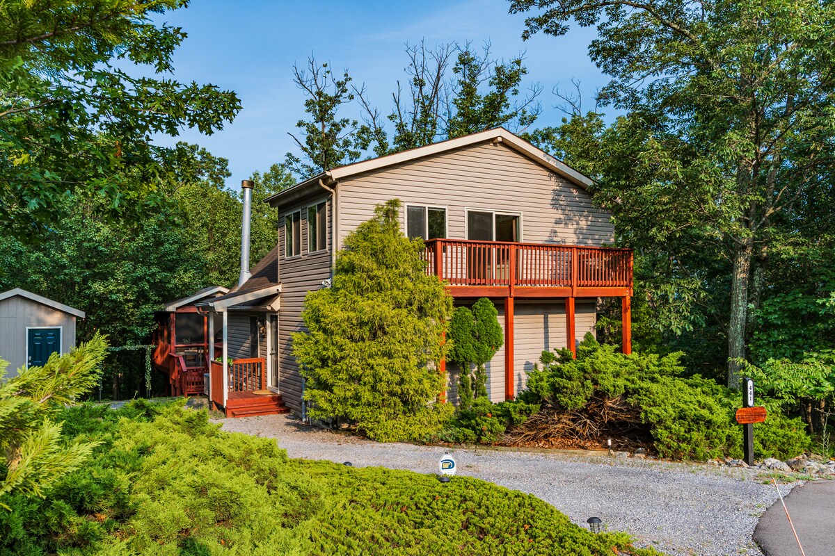 Uniek ruime ontsnapping voor koppels, kleine gezinnen of soloreizigers. 6 meter grote kamer, muur van ramen met uitzicht op groot dek, eiken vloeren NIEUW BUBBELBAD IN EEN eigen omgeving. Kingsize slaapkamer met eigen badkamer. De loft heeft een eenpersoonsbed. Modern met details van mcm en vintage creëren een magisch toevluchtsoord voor je in de boomtoppen. Op 2 hectare. Wandel naar de top van Cacapon Mountain vanuit de achterdeur. Snelle rit (3 minuten) naar privé gemeenschappelijk zwembad/bubbelbad/tot zwembad (alleen in de zomer). 10 minuten naar Berkeley Springs met Romeinse baden, kunsten