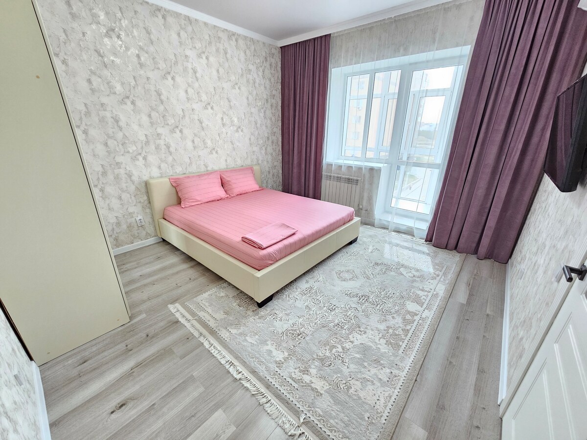 Ik huur 1 kamer appartement van premium klasse in de nieuwe wijk Batys-2, Altair wooncomplex, Nazarbayev school op loopafstand, Dostyk zwembad, ijs arena, ZhKPE JEK, alle beschikbare communicatie, stops, bewaakte tuin, videobewaking. Het appartement heeft alles voor een comfortabel verblijf: strijkijzer, wasmachine, fornuis, waterkoker, theegerei, schoon beddengoed, wifi, smart-tv. Wij verstrekken zakelijke reisdocumenten. We staan ook klaar om wegwerpartikelen en badjassen te leveren.