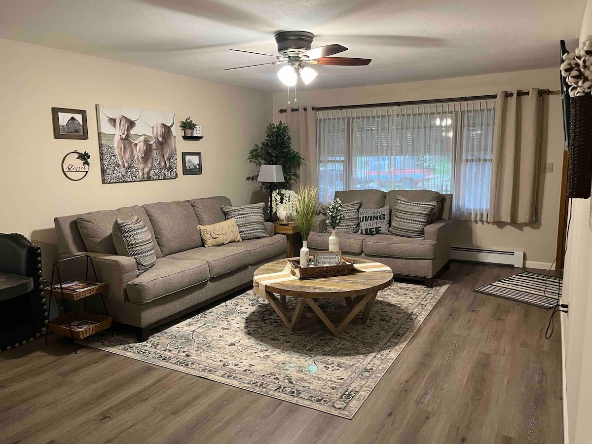 1 slaapkamer met queensize bed. 1 badkamer met inloopdouche. Volledige keuken. Trek de bank en televisie (Roku-streaming) in de woonkamer uit. Wasmachine en droger. Veel parkeergelegenheid. Slechts 10 minuten van Whetstone Bay aan de rivier de Missouri.