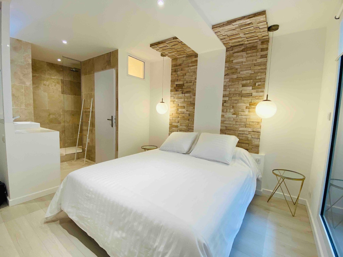 " Le 11 " is een appartement ⭐️⭐️⭐️⭐️ gewijd aan reizigers die een hoge standaard van luxe willen, evenals een innovatief en atypisch ontwerp. Het bestaat uit een slaapkamer met een groot vast bed (160/200) met een eigen badkamer en een eigen badkamer en uit op een Italiaanse douche, een uitgeruste keuken, een eigen terras van 15 m2 en een beveiligde parkeerplaats. Het is ook uitgerust met een grote 4K-tv met EEN verbonden Netflix-streamingservice 🍿🍫🎥