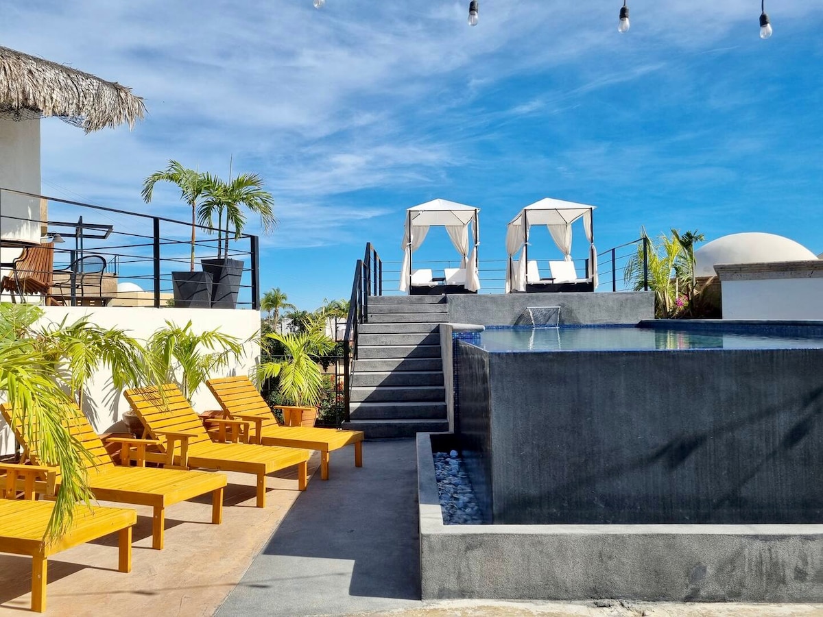 Epische uitzichten vanuit alle richtingen! Je wordt weggeblazen door de schoonheid van Baja California Sur van dit gloednieuwe, elegante en volledig ingerichte appartement. Geniet van koffie op het dek terwijl je de zonsopgang boven de bergen bekijkt. Ontspan na het surfen en zwemmen op het strand van Cerritos (op slechts enkele minuten lopen of met de auto) in de hot tub terwijl de zon ondergaat over de Stille Oceaan. Met vrij uitzicht vanaf elke hoek zie je gegarandeerd walvissen breken tijdens het seizoen. Meer privacy dan appartementen