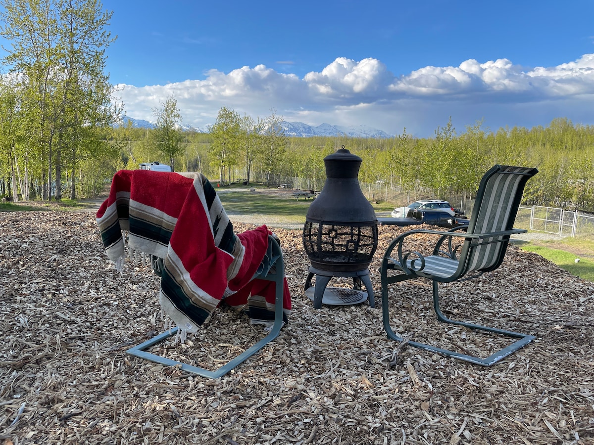 Camper, terras en vuurplaats aan het Matanuska-meer