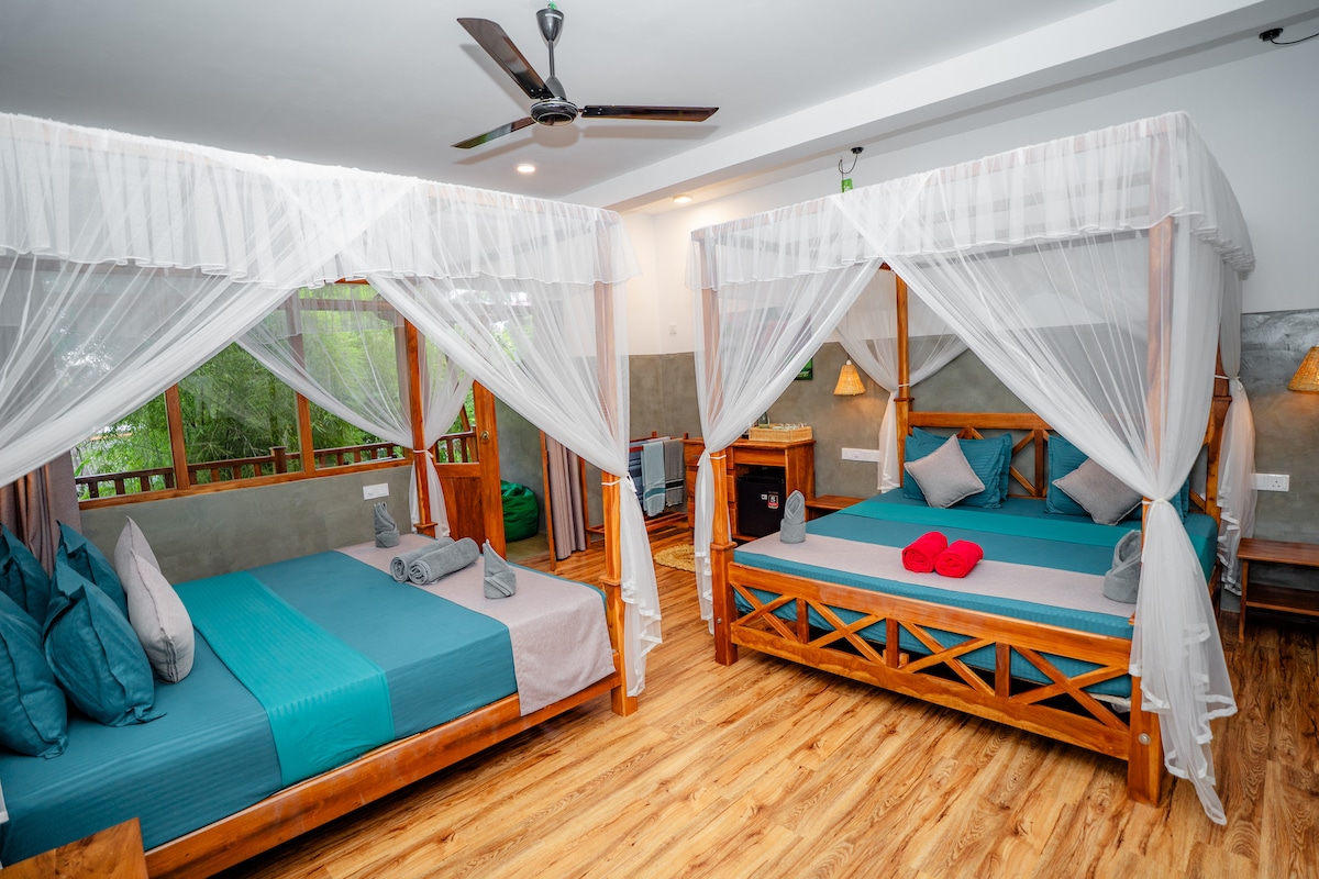 Word wakker met het geluid van vogels en een verfrissende bries van het regenwoud! Deze uniek ontworpen bungalow met twee slaapkamers naast grote bomen en dicht bij een beek is perfect voor een pauze van je reis rond het eiland. Hier kun je echt in contact komen met de natuur en op een comfortabele manier genieten van ons heiligdom met zijn wilde dieren. Geniet vanaf de veranda van een prachtig uitzicht over de Thee- en Regenwoudvallei of spot wat apen en gigantische eekhoorns die Jackfruits kauwen. Vegetarisch eten is beschikbaar, vers bereid op aanvraag.