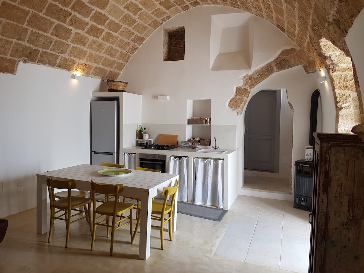 Typisch Salento-gebouw met sterrengewelven, ruim en licht op een uitstekende locatie voor een bezoek aan de mooiste stranden en dorpen van Salento. De woning heeft twee grote slaapkamers met eigen badkamers; de eerste bevindt zich op de begane grond, de tweede op de eerste verdieping met toegang vanaf een externe trap. Gasten zullen een prachtige vertrekkende ruimte, uitgeruste keuken, wasserette en terras hebben.