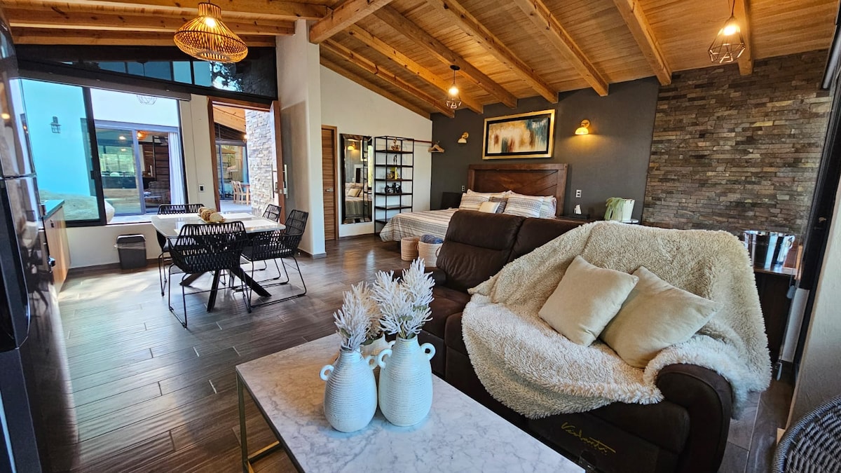 cabaña moderna con estilo wabi-sabi. con vistas panorámicas y atardeceres espectaculares a dos minutos del centro de Mazamitla.