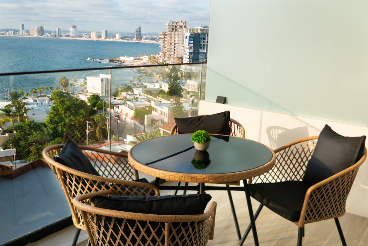 Ervaar Mazatlan vanaf de hoogten in dit exclusieve appartement. Geniet van luxe afwerkingen, 2 slaapkamers met queensize bedden en tv, een ruime woonkamer met balkon aan de oceaan en een volledig uitgeruste keuken. Het heeft ook een spectaculair zwembad op het dak. Gelegen voor de Malecon en op slechts een steenworp afstand van de Gouden Zone, heb je direct toegang tot stranden, restaurants en uitgaansgelegenheden. Ideaal voor wie op zoek is naar comfort, een ongelooflijk uitzicht en een onovertroffen locatie.