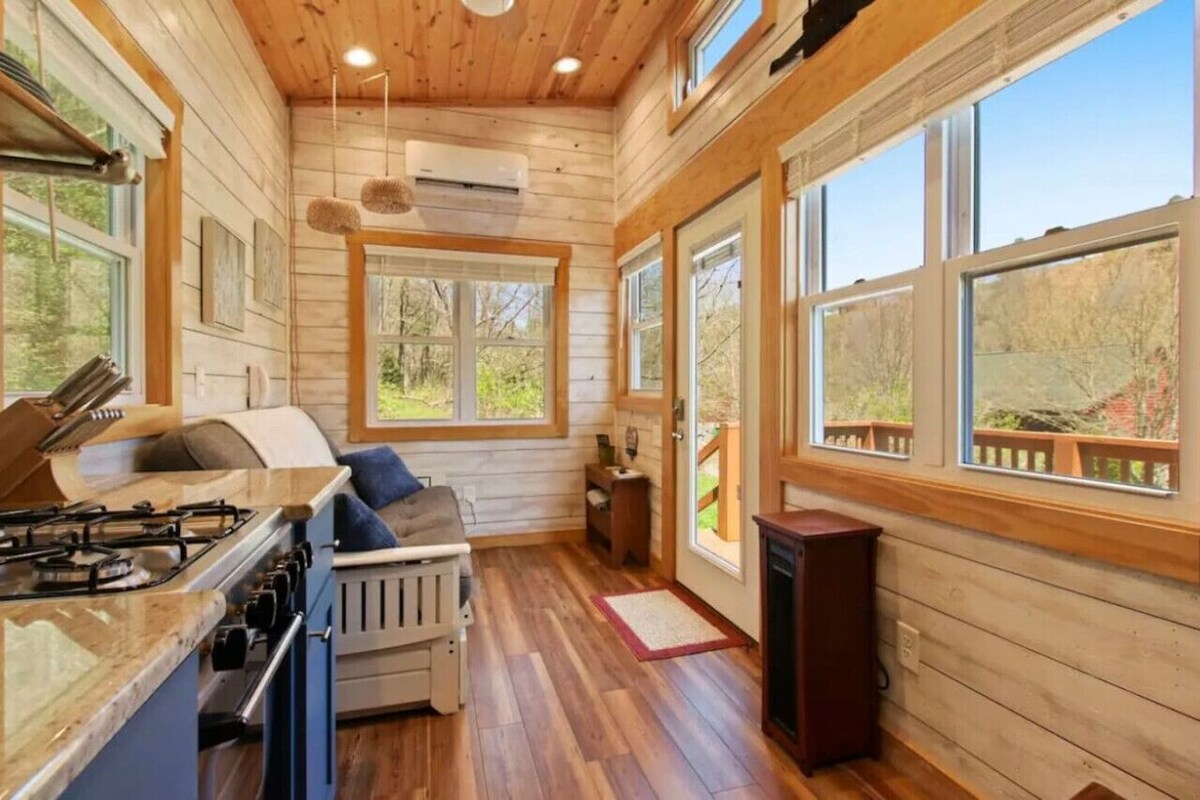 Onze ruimte, een op maat gemaakt van HGTV-featured tiny house builder Randy Jones, ligt op een bergkam met een ongeëvenaard, 270 graden uitzicht op Grandfather Mountain, alle drie skigebieden, op Tennessee en Virginia's Mount Rogers. We liggen op 20 minuten van Boone en 15 minuten van West Jefferson, en nog dichter bij de Blue Ridge Parkway en New River-activiteiten zoals vissen en tubing. Als je hebt nagedacht over inkrimping of als je het leven gewoon wilt proberen voor een uitje, dan is dit de plek!