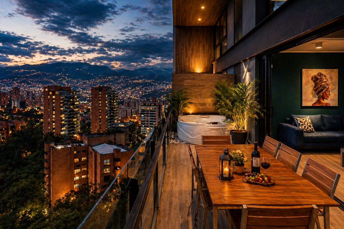 Luxury stay in Energy Living Medellín most iconic building. Private balcony with jacuzzi and open city & mountain views. Prime location just minutes from Provenza. • Private balcony + jacuzzi • Separate living room & bedroom • Queen bed + AC • Spacious layout (1,000 sq ft) • Fast WiFi – ideal for remote work • Rooftop pool with panoramic views • Jacuzzi, steam room & gym • Restaurant / bar lounge + room service • 24/7 security & front desk