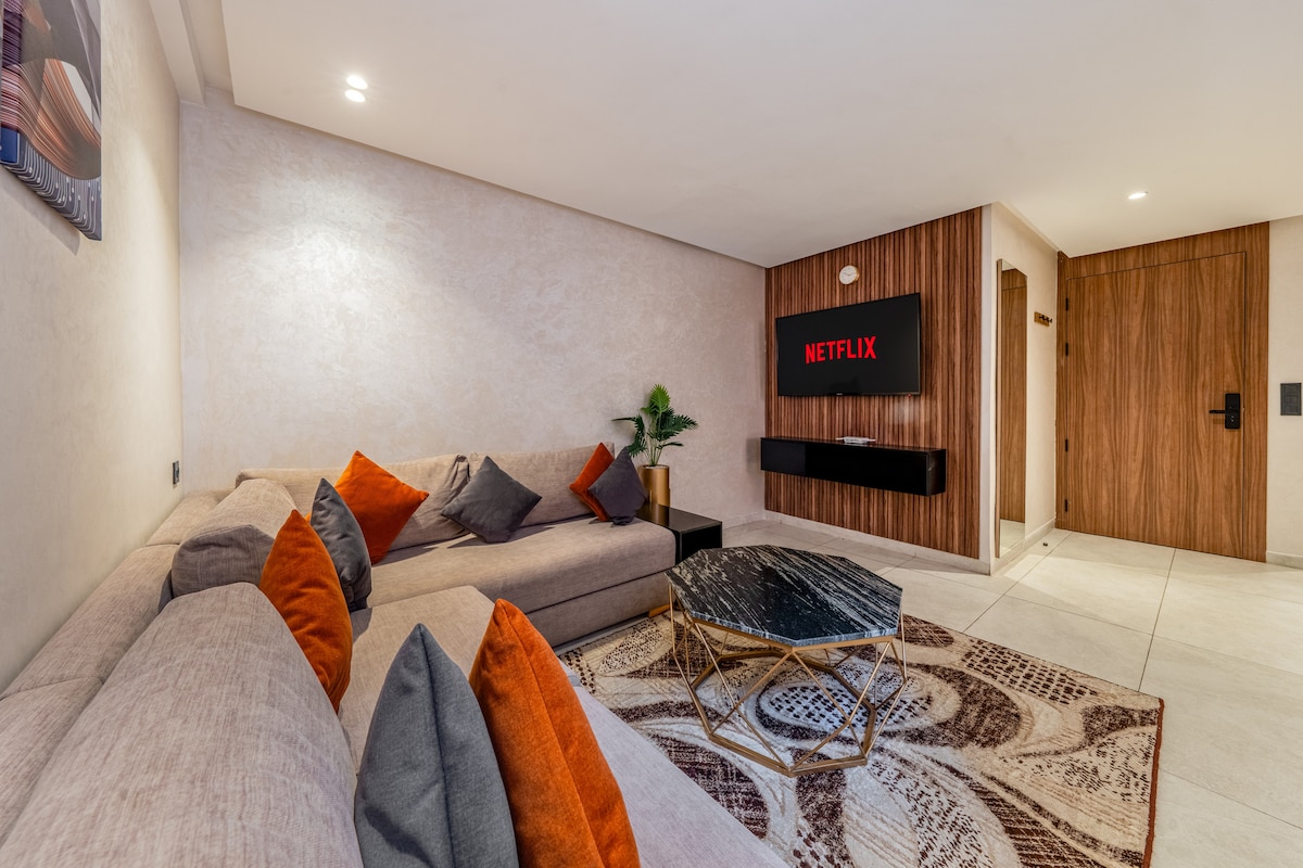 Geniet van uw verblijf in een modern en goed ingericht appartement naast alle voorzieningen van een nieuwe residentie. Het heeft 1 slaapkamer uitgerust met 4K thuisbioscoop, woonkamer, badkamer, Amerikaanse keuken en klein terras. • Krachtige airconditioning • Snelle toegang tot Carré Eden, Majorelle, restaurants • Meeslepende thuisbioscoop Marrakech zal je altijd verwelkomen. ☺️