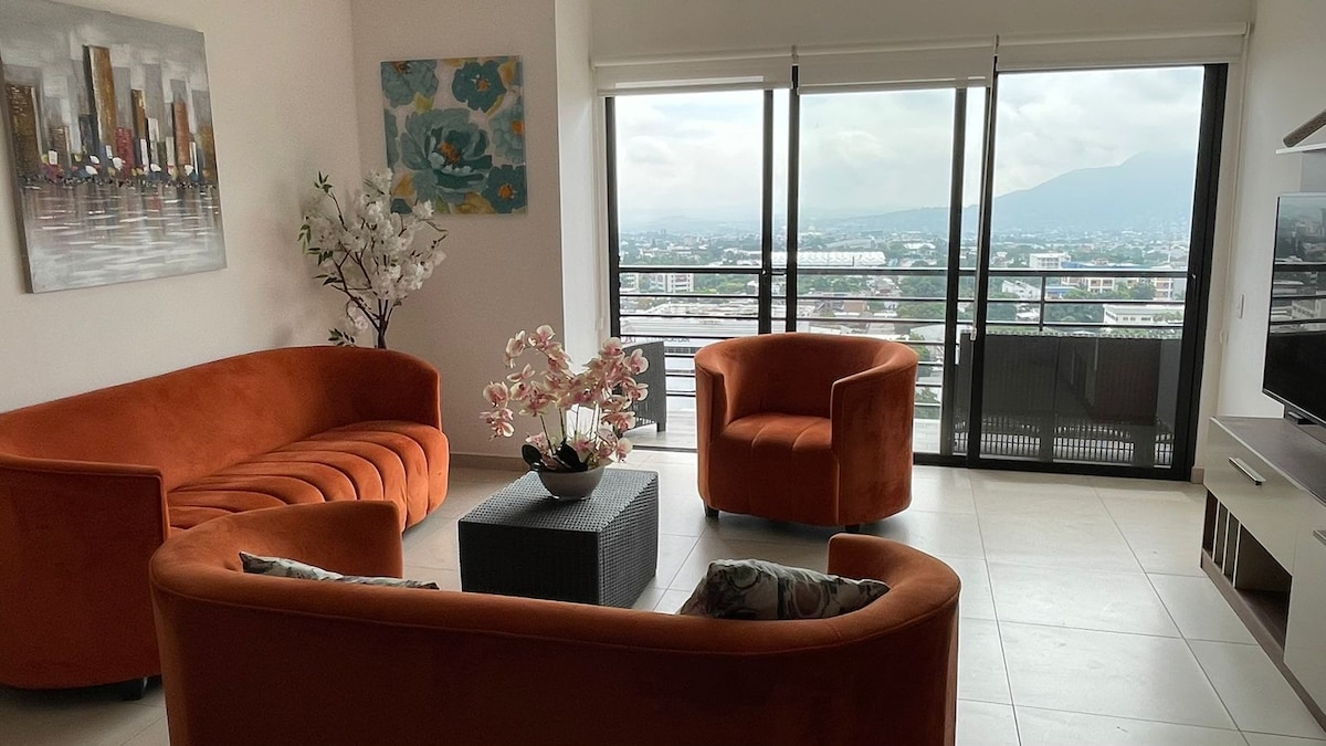 Welcome to an apartment with a tasteful and dynamic concept, for an amazing stay. Located in one of the safest areas of the capital. The tower has a swimming pool, gym, social areas, playroom and rooftop available for guests (some with prior reservation). The apartment is located between 5 to 10 minutes from the best shopping centers, restaurants and exclusive bars. The apartment has an unbeatable view of the volcano and the city of San Salvador. Listing has a very easy self check-in mechanism
