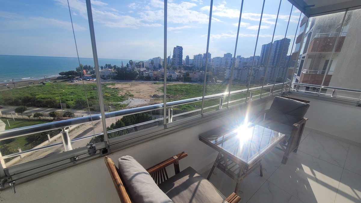 1+1 appartement met dubbele airconditioning, zeezicht, gemeubileerd.