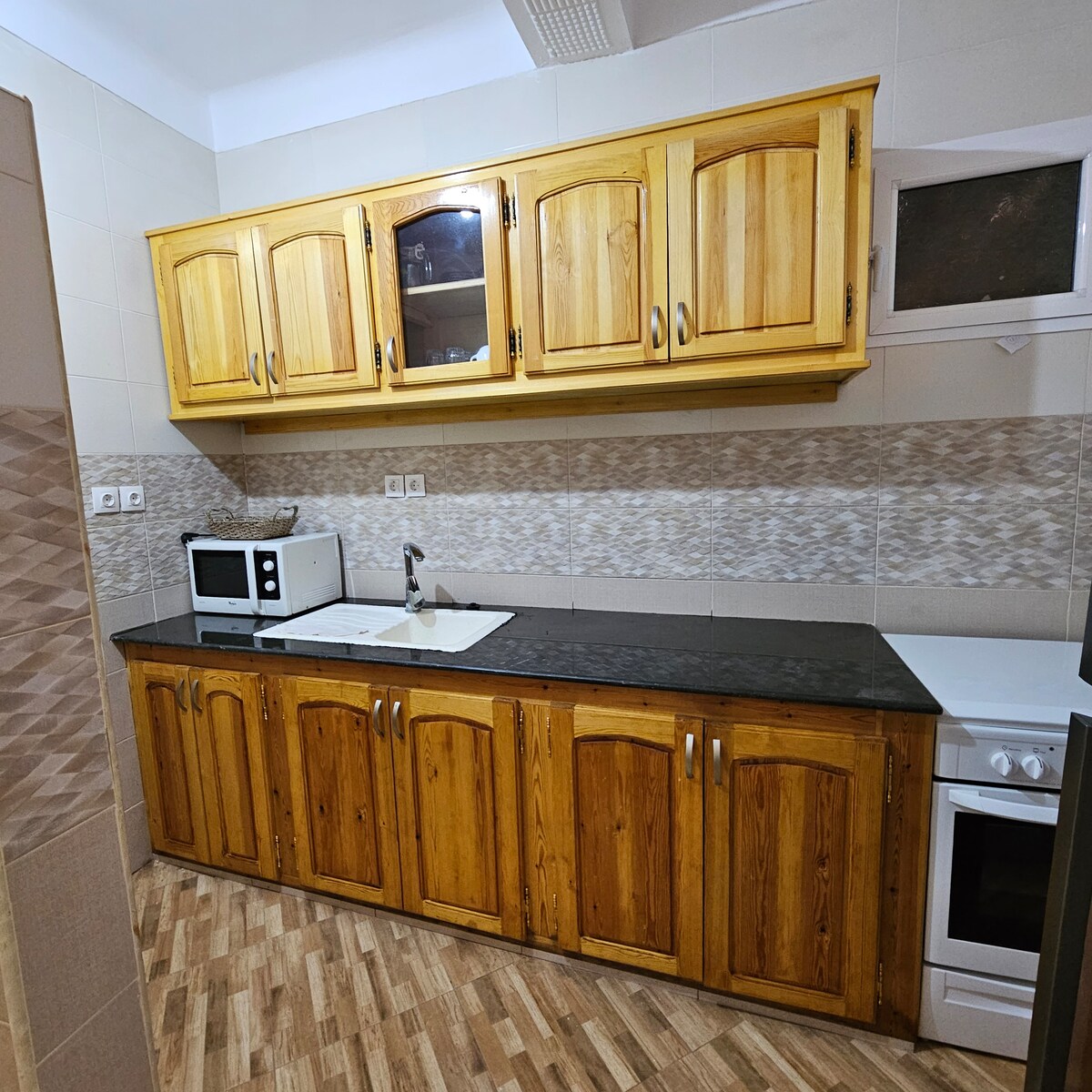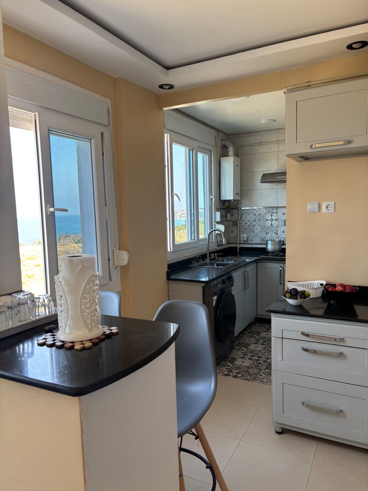 Ruim, gerenoveerd appartement met 3 slaapkamers in Cherchell, Algerije, met een adembenemend uitzicht op zee. Drie grote slaapkamers, een gloednieuwe keuken en badkamer, en dicht bij gezinsvriendelijke stranden. Op loopafstand van strand, winkels en verse lokale producten. Airconditioning in de open woonruimte en in een van de slaapkamers. Wifi beschikbaar tegen meerprijs. 24/7 beveiliging buiten. Voor meerdere gezinnen gelden extra kosten.