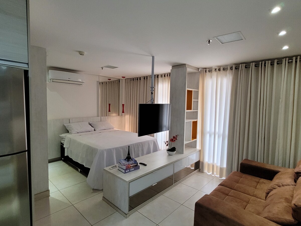 Een ruime loftstudio van 50 vierkante meter, open indeling, biedt vrijheid en comfort, 1 tweepersoonsbed, 1 slaapbank die ook geschikt is, Geniet van gemakkelijke toegang tot alles wat je nodig hebt in deze goed gelegen accommodatie, naast Flamboyant Park (prachtig park met groene gebieden, 2 meren, hardloop- en fietsbaan), voor het Serra Dourada Stadion waar geweldige evenementen plaatsvinden en zeer dicht bij Flamboyant Shopping Mall en het Oscar Niemeyer Cultural Center waar shows en evenementen ook plaatsvinden.
