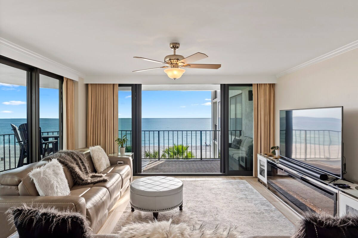 Boasting infinite Gulf views, an open floorplan, and elegant touches throughout, this deluxe, beachfront condo is guaranteed to please even the most discerning guests. The great room boasts a fantastic, full kitchen with stainless steel appliances and counter seating for three. Enjoy more formal meals together at the indoor table for six or al fresco on your furnished balcony. The cozy, sunlit living area includes a gas fireplace and a wall-mounted, flatscreen TV, while the sliding glass doors open the entire space up to the balcony. And for sleeping arrangements, this condo features three comfortable bedrooms including a "mermaid-friendly" kids' room. Guests will also enjoy access to a variety of on-site amenities including a fitness room, a seasonally-heated pool, and a hot tub.