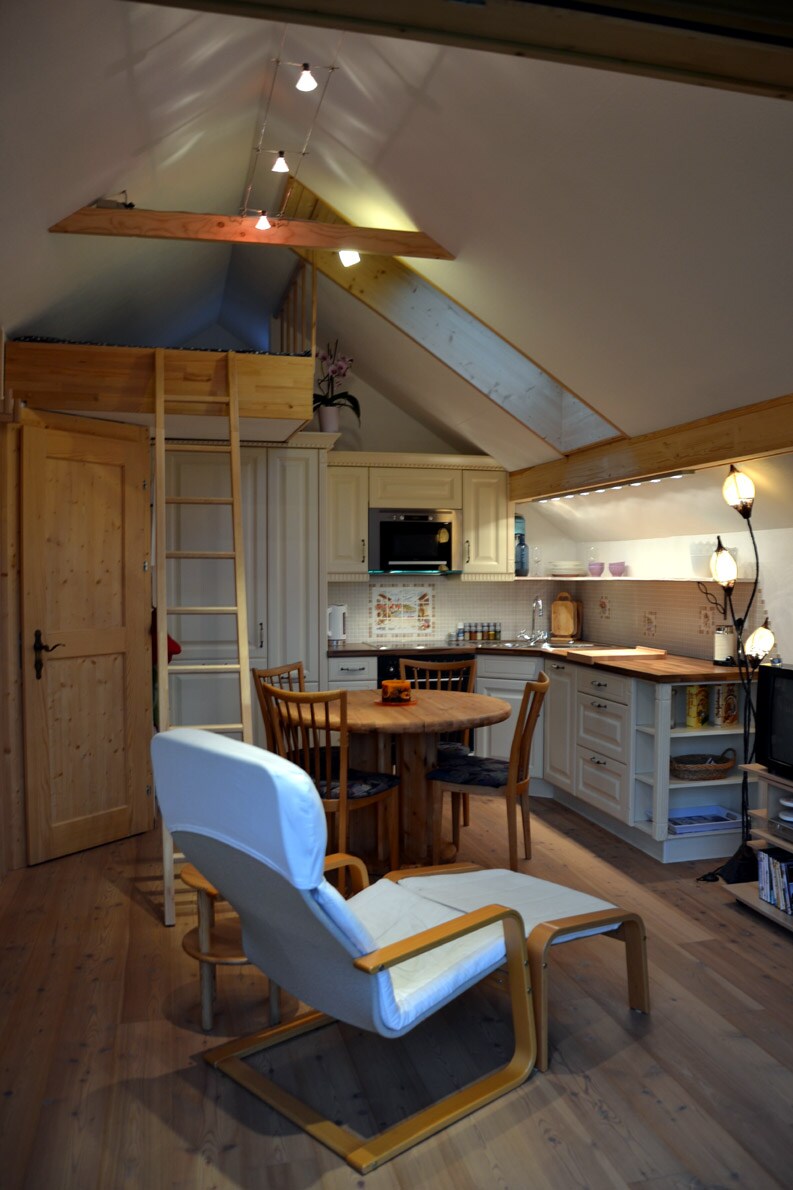 Geniet van de natuur in het zelfvoorzienende tiny house en het sensationele uitzicht op Traunstein, Grünberg en in de verte. Probeer een duurzamere levensstijl door bewust gebruik te maken van middelen. Onze kippen en 4 dwergen bevinden zich op de helling eronder/naast het tiny house. In het tiny house vind je een kitchenette, een badkamer met douche, een vide met tweepersoonsbed en een uitschuifbare bank in de woonkamer. Aan de voorzijde van het huis kun je comfortabel ontspannen en genieten van de zon.