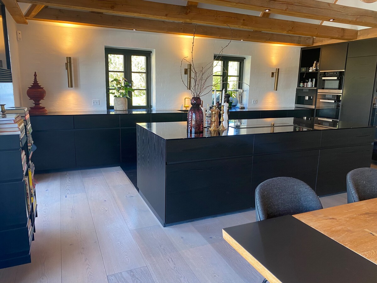 Deze oase dicht bij het strand op het prachtige eiland Funen is ideaal voor een gezinsvakantie met meerdere generaties of meerdere vrienden die elkaar willen ontmoeten en samen willen genieten. Naast de enorme eetkeuken met ruimte voor 14 zittende gasten, is er een gigantische bank die uitnodigt tot een filmavond op de grote tv. Er is veel buitenruimte en we bieden tennis, golf, voetbal, enz. en een heerlijke mahoniehouten bank rond de open haard waar u kunt ontspannen met een heerlijke pizza uit de grote Italiaanse pizzaoven.