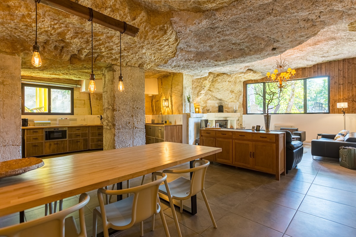 Het Domaine des 4 Lieux verwelkomt je in zijn unieke 4-sterren grot, uniek in grootte en helderheid! Geniet van een ongelooflijke ervaring midden in de natuur. Je wordt verleid door de charme van de rots, het volume van de woonkamer, allemaal in de idyllische omgeving van een natuurgebied. Terras met verwarmd zwembad (zie details). 4 slaapkamers, 3 badkamers. Veel voorzieningen beschikbaar. Eigen toegang. 7 parkeerplaatsen. Geclassificeerd 4**** voor 8 bedden. 11 bedden mogelijk + studio 2 pers.