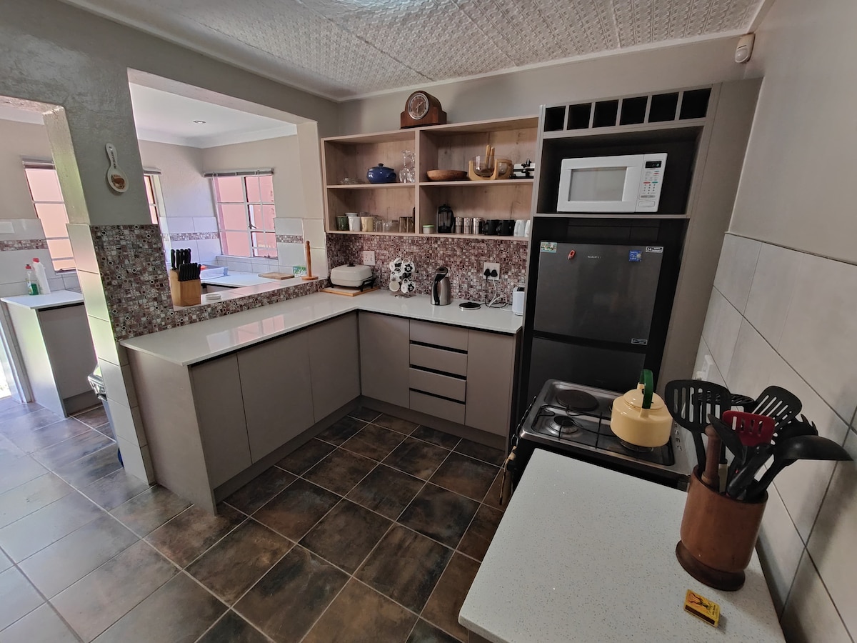 HOSTS WONEN IN HET HOOFDHUIS OP HETZELFDE TERREIN! (Zonne-energie geiser en elektriciteit , putwater, wifi, waarschuwingsalarm en alarmsysteem, CCTV) Aangename en serene plek om te verfrissen en te ontspannen, of het nu op vakantie of voor zaken is. Geen CONTANTE BETALINGEN! Alleen online betalen! Bedankt.