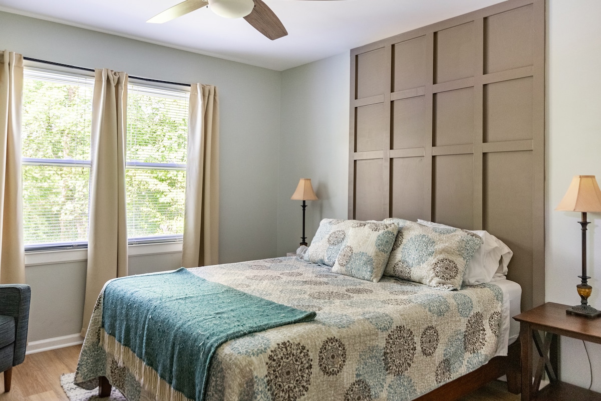 Doe rustig aan in deze unieke en rustige blokhut met centrale lucht/warmte en sleutelloze ingang. De woonkamer heeft een 55 in smart-tv met Roku, kleine koelkast, magnetron en keurig. Het is een geweldige plek om op afstand te werken. De slaapkamer met queensize bed heeft een smart-tv en een bureau. Je hebt een overdekte parkeerplaats en toegang tot het hoofdverblijf aan de voorkant met een kleine tafel en 2 stoelen, schommel op de veranda en rockers. Helemaal geen huisdieren & niet roken ajb. We hebben allergieën