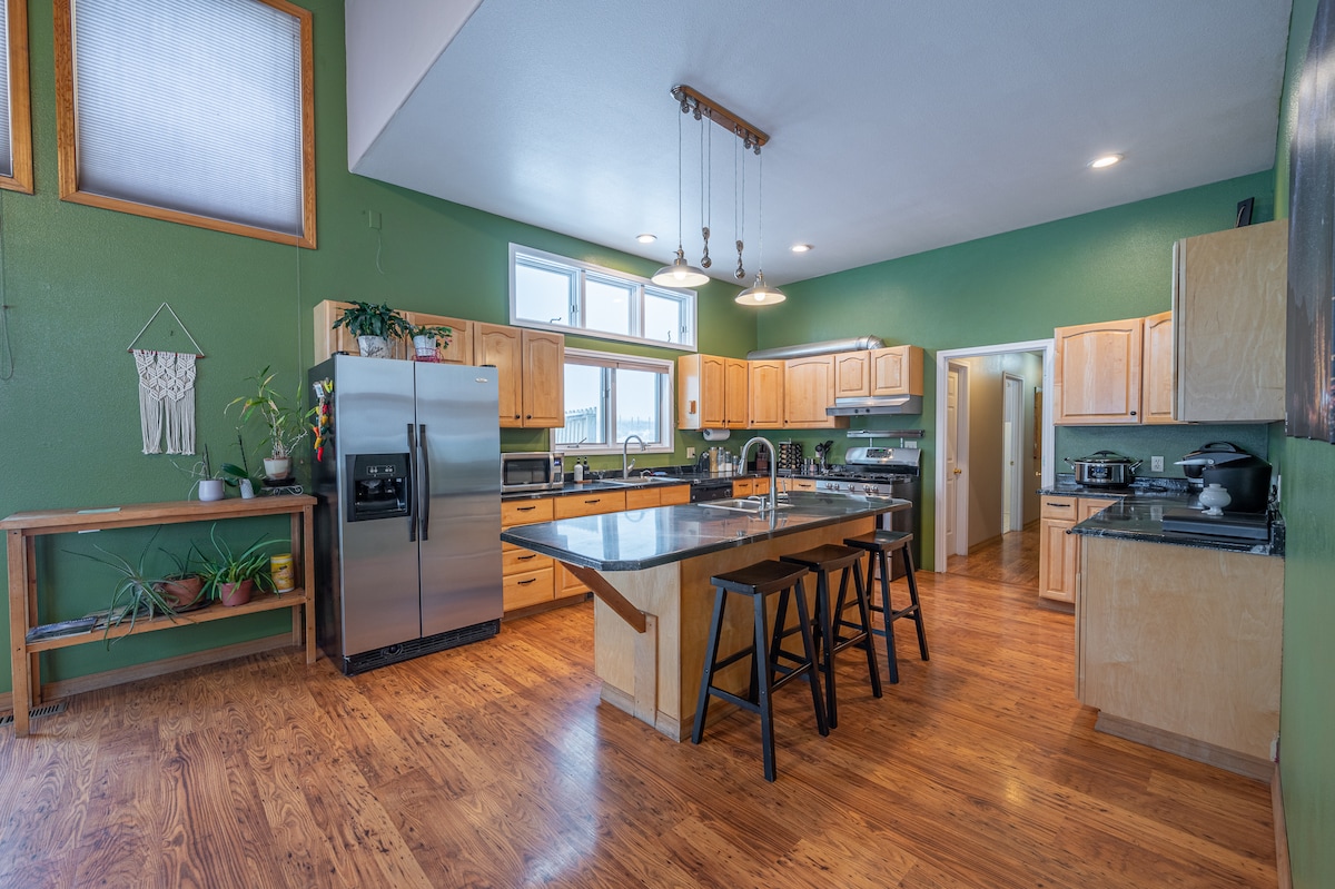 This modern rustic home features views of the Elkhorn mountains out the back and Wallowa mountains out the front, all only 15 minutes from downtown Baker City making it the perfect basecamp for your adventures. Set on 7 acres with three large bedrooms, 2.5 bathrooms and roomy living areas there’s plenty of room to unwind. The back deck includes a hot tub, BBQ, outdoor dining set, and propane fire pit with a sauna in the garage. Enjoy the views while having a spacious place to relax and unwind!