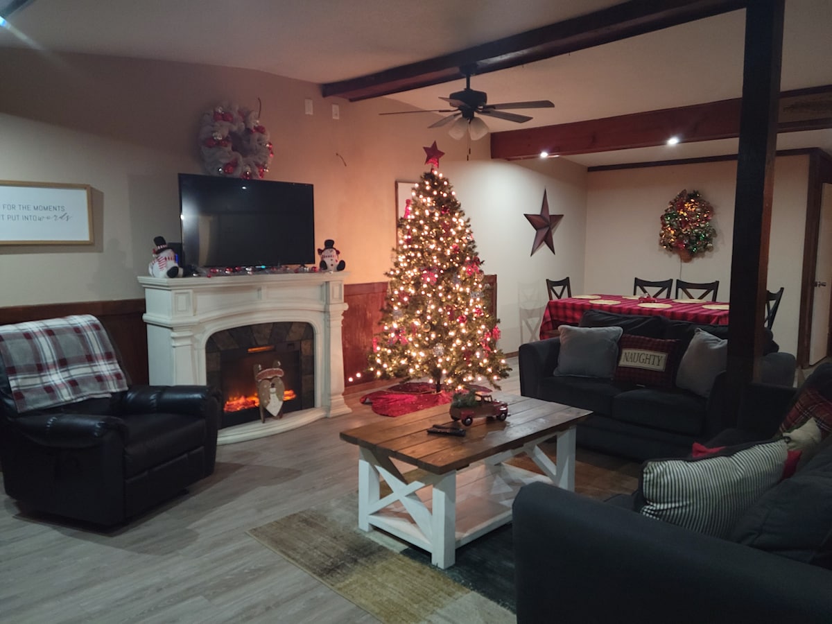 Bring the whole family, You get both apartments that connect. With this spacious 5 Bedrooms, 2 kitchens, 2 bathrooms, 2 laundry, plus 3 foldout twin beds is plenty of room for the whole family to spread out like jelly. We have a covered picnic area right out front with fire pit and grill. If you want to play in the creek or fish there is also a gazebo overlooking the creek. Trail 14 is straight across the road for all you trail riding adventures. We are close to Dollar Store and gas stations.