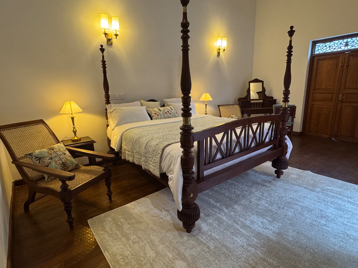 Manu&Marian Executive Bedroom is de meest exclusieve keuze van Deep Blue Resort. Op de bovenste verdieping van de hoofdvilla domineert het de oceaan, de uitgebreide kokosnoottuin en het zwembad. De enorme veranda is uitgerust met een schommelend tweepersoonsbed, gemakkelijke stoelen en een openluchtstudiohoek. De slaapkamer is geschikt voor twee personen in het kingsize bed en is mooi ingericht met handgemaakte tapijten van Jez Look Batik Studio en antieke meubels. Aangrenzende badkamer met douche maakt de schoonheidsroutine een waar genoegen
