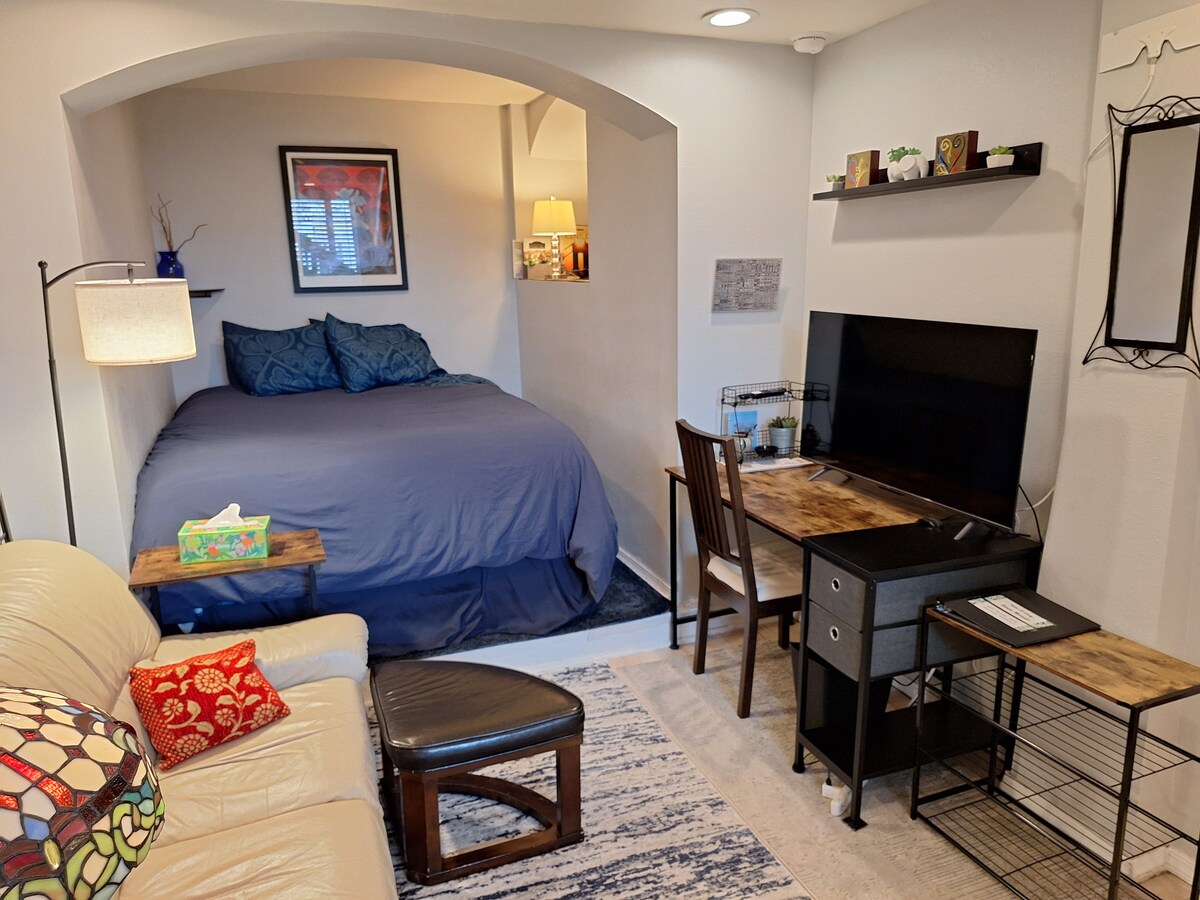 Word wakker met het rustgevende groene uitzicht vanaf deze onlangs gerenoveerde (mid-2023) studio genesteld op een slaperig blok in Bernal Heights. Een rustige achtertuin met een Boeddha-sculptuur en een modernistisch geïnspireerde binnenplaats naast de slaapkamer, kitchenette en badkamer. Gratis parkeren op straat (parallel) is beschikbaar in mijn blok en omliggende straten, niet beperkt en meestal gemakkelijk beschikbaar. Houd er rekening mee dat de studio een gemeenschappelijke voordeur en foyer deelt met het hoofdhuis boven.