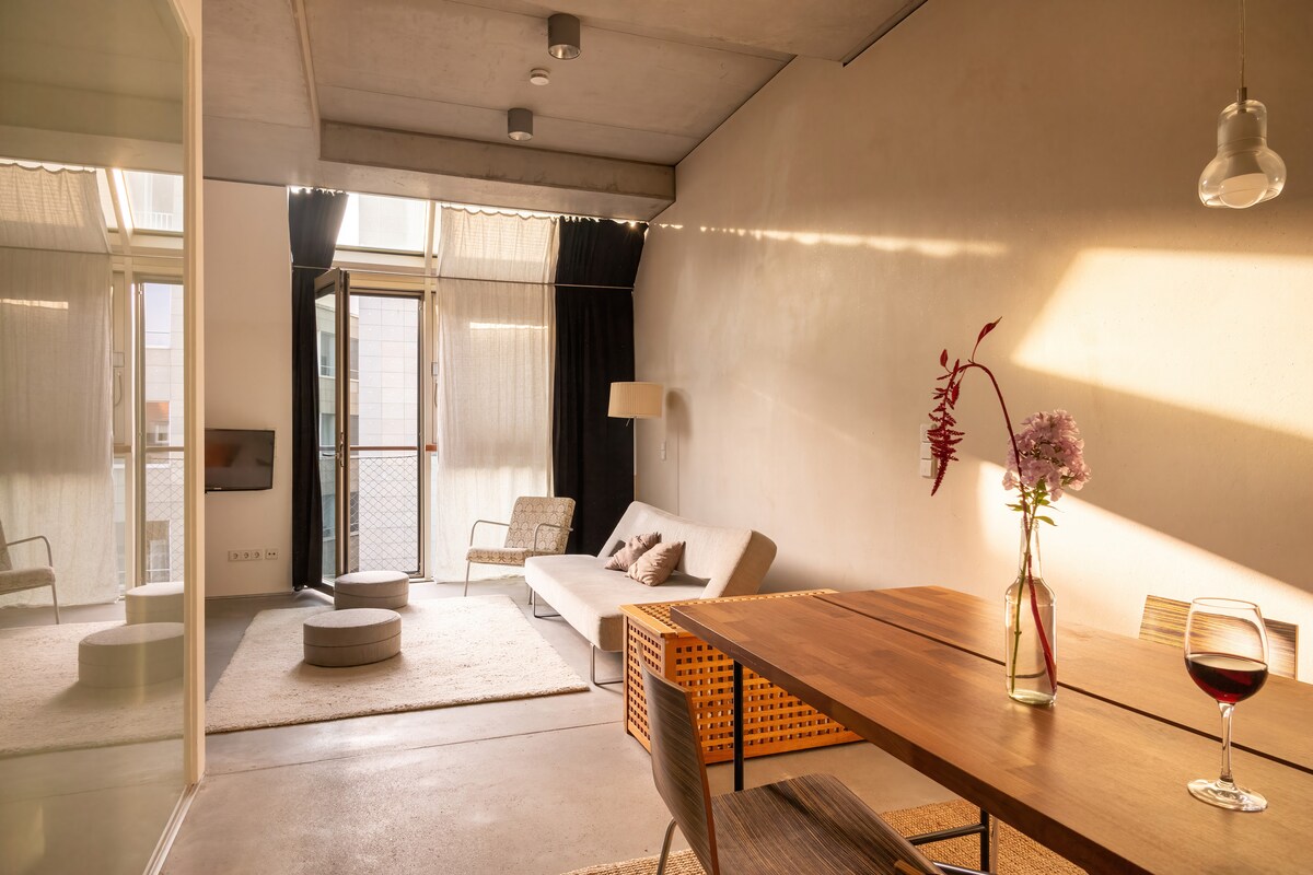 Het studio-appartement combineert de gemakken van een hotelsuite met de eigen sfeer van een huis en biedt alles wat je nodig hebt om volledig te genieten van je verblijf in Berlijn: een balkon om van je ochtendkoffie te genieten, een volledig uitgeruste keuken die integreert in de open woon- en slaapruimte, een kleine werkplek, twee flatscreen-tv 's en een ruime badkamer voor privé wellnessmomenten. Beschikbaar op verdieping 2-4.