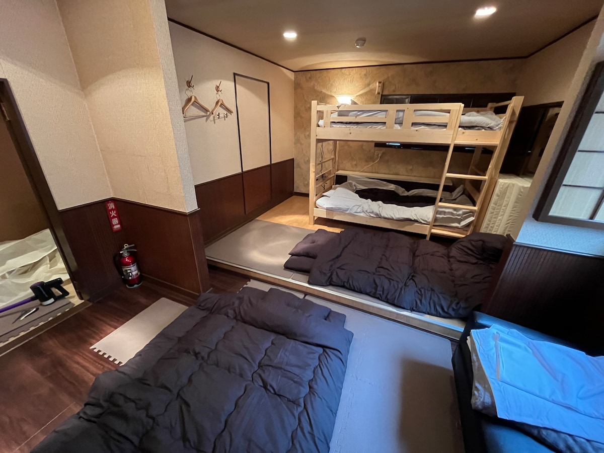 ~ Gehele 1 verdieping ontspannende ruimte ~ Het is een herberg waar iedereen kan ontspannen tot 16 personen. We hebben een manager die op de eerste verdieping woont. Als je nog vragen hebt, laat het ons dan weten door ons een bericht te sturen op Airbnb. Informeer naar mensen met huisdieren. De prijs is vastgesteld op de volgende prijs. 3.000 yen/één (tot een middelgrote hond) [Gratis faciliteiten] wifi [Betaalde faciliteiten] -Laundromat Weber elektrische barbecue 2.000 yen/dag [Hoofdkeukenfaciliteiten] - Cassettekachel - magnetron - Broodrooster Koffiezetapparaat [Voorzieningen voor bad en wastafel] - Badhanddoeken en handdoeken Shampoo, conditioner en douchegel Haardroger Tandenborstels [Over de slaapkamer] ☆Kamer in Japanse stijl 8 matten 2 kamers (8 sets futons) ☆Westerse kamer 10 tatami matten (2 slaapbanken, 2 futons) Kamer ☆in Japanse stijl met 8 tatami-matten (4 futonsets)
