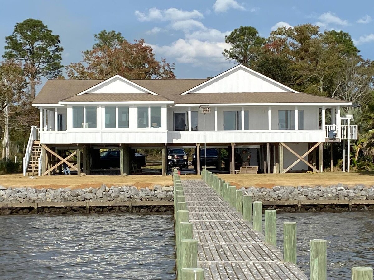 This charming cottage sits directly on the bay on Mon Louis Island and provides breathtaking views from most of the home! You will love the open floor plan and the huge island in the kitchen. Enjoy your morning coffee on the comfortable covered porch watching the sunrise over the bay, an afternoon grilling out, or an evening relaxing by the fire. The beautiful Dauphin Island beaches are just a 10 minute drive away and 30 minutes to historic Downtown Mobile! No ocean access from the property.