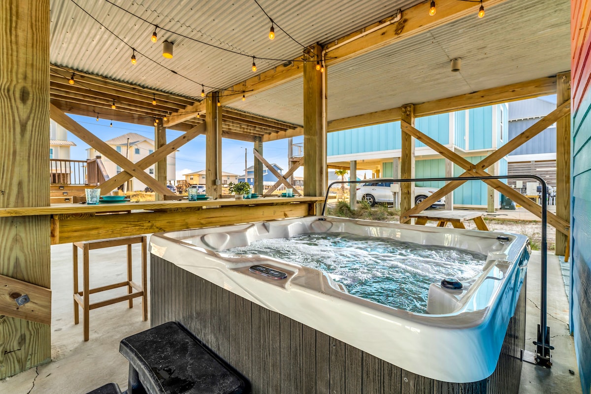 ✔ Directly Across From Public Beach ✔ Private Hot Tub ✔ All Dogs Welcome, Dog-Friendly Beach ✔️ 4 bedrooms, 4 baths, Sleeps 10 ✔️ Gulf-Facing Deck – Soak in the salt air and watch the waves roll in from an expansive deck with lounge seating. ✔️ Outdoor Oasis – Hang in your own shaded bar area under the house, complete with hot tub, cornhole, and comfy seating ✔️ Beach Gear, Linens & Soaps Included. ✔️ Outdoor Shower