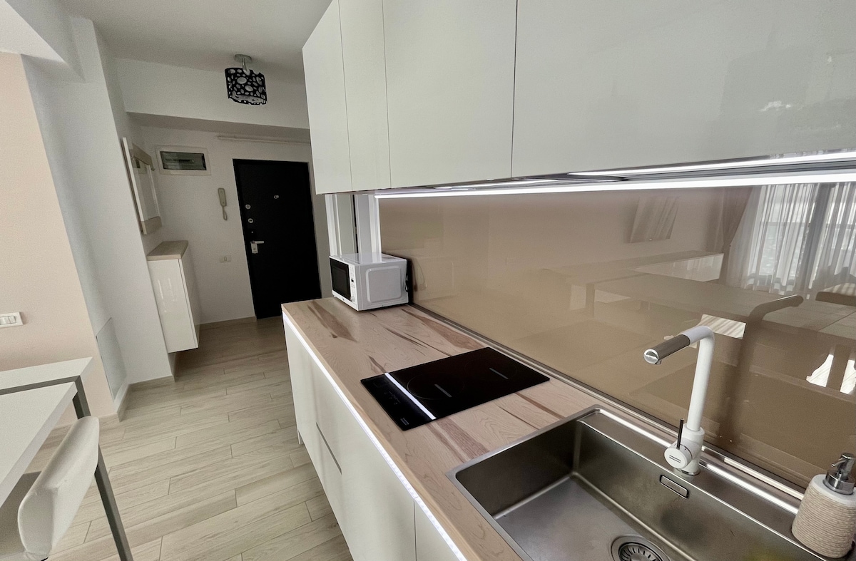 Op steenworp afstand van Neversea Beach en Old Town Deze privéstudio biedt een onovertroffen locatie direct voor Neversea Beach, met gemakkelijke toegang tot zowel het strand als de historische oude binnenstad van Constanța. Slechts een korte wandeling van het Ovidiu-plein, waar je het iconische Constanța Casino kunt verkennen. Het gebied is levendig met een verscheidenheid aan restaurants en cafés, en voor uw gemak bevindt zich een supermarkt (Profi) op de begane grond van het gebouw.