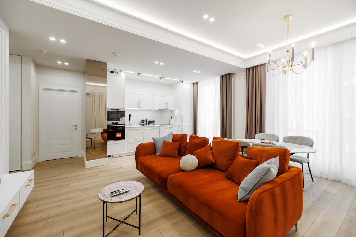 Relaxează-te într-un apartament elegant în inima Chișinăului, cu finisaje din marmură și lemn natural. Te vei bucura de o saltea premium Vi-Spring Bedstead, o cadă spațioasă și un balcon cu șemineu decorativ. Apartamentul are perdele cu telecomandă și espressor cu cafea pe boabe Blocul beneficiază de recepție și pază 24/24, oferindu-ți un plus de siguranță, confort și liniște pe durata întregii șederi.