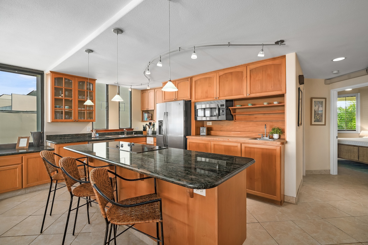 A modern surf oasis nestled on an overlook with panoramic ocean views, stunning sunsets, and the famous Bali Hai. We were featured in the June issue Sunset Magazine. You'll never want to leave this modern Hawaiian styled 2 bedroom, 2 bath condo. We have everything you’ll need and want for the most relaxing stay of your island vacation and only steps away from food, drinks, the pool and the beach. Whale watch from the lana'i in the winter, or snorkel our beautiful Hideaways beach in the summer.