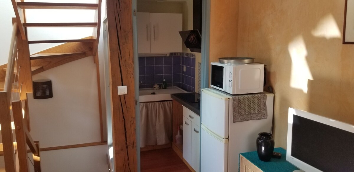 Studio 1 kamers 27m2. Uitrusting: - Sleutelkastje met code -reversible-clim - Volledige keuken (koelkast, oven, kookplaat, afzuigkap, gootsteen, filterkoffiezetapparaat of Senseo, broodrooster, waterkoker, magnetron, servies , kookgerei... - Badkamer: douche, wastafel, toilet (handdoeken niet aanwezig) - 2 bedden in 140, 1 bed+1 slaapbank, dekbed + kussen (beddengoed lakens niet meegeleverd). - TV, TNT - Wifi - Tuinlounge op terras van 9 m2.