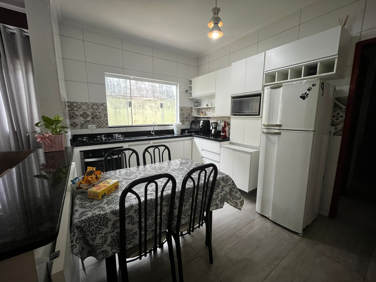 Linda Casa em Mongaguá, a 90 metros da praia. Excelente espaço externo com piscina, churrasqueira/forno e fogão a lenha para fazer aquele churrasco ou aquela comida com muita diversão na beira da piscina. Sala de estar com Mesa de sinuca e tampão de ping pong. Internet WI-FI NETFLIX Sistema de alarme Total de 3 quartos (sendo 4 camas de solteiro e 2 de casal, com mais 7 colchoes a parte). Casa conta com 3 banheiros no total. Casa terreá, excelente para pessoa com mobilidade reduzida.