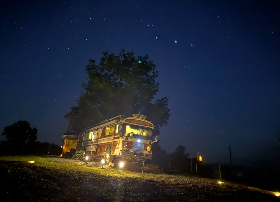 Lees de hele advertentie voordat je reserveert* Glamping op de boerderij. Geniet van een verblijf in een verbouwde schoolbus omgebouwd tot een klein huis:een Skoolie. De Skoolie is ongeveer 320 vierkante meter groot. Een korte wandeling op de boerderij brengt je naar prachtige zonsondergangen en zonsopgangen. Geniet na het donker van het kampvuur en rooster je marshmallows en geniet op heldere nachten van de sterren. Geniet op sommige zomeravonden van vuurvliegjes die sprankelend zijn in de weiden.