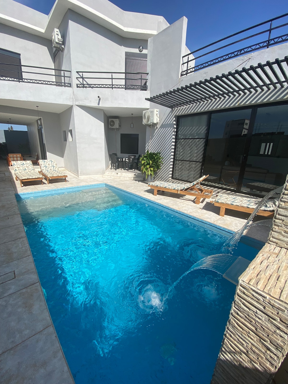 Slechts 15 minuten van de luchthaven en 15 minuten van het bruisende stadje Diamnadio, omgeven door natuur, vind je deze prachtige moderne villa met 4 slaapkamers en privézwembad. Gelegen op 45 minuten van Dakar en 45 minuten van de kleine kust, midden in de natuur en ongeëvenaarde rust, biedt het een perfecte oplossing om Senegal te ontdekken tijdens je vakantie of op te laden voor een weekend. Dit rustige huis biedt een ontspannen verblijf voor het hele gezin