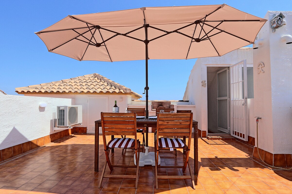 Een knus huis om vakantie door te brengen of een paar ontspannen dagen. Voorzien van airconditioning (de woonkamer en de 3 slaapkamers), wifi, Nespresso-apparaat en een barbecue. Gelegen in urbanisatie Altomar 1, een rustige omgeving met mooi gemeenschappelijk zwembad en groene gebieden om te ontspannen. Op het terras (veranda) begroet de zon je 's ochtends. Prachtig uitzicht op de oceaan wordt gewaardeerd vanuit het ruime solarium. Op de helling ligt het prachtige strand van Carabasí op 1,5 km afstand