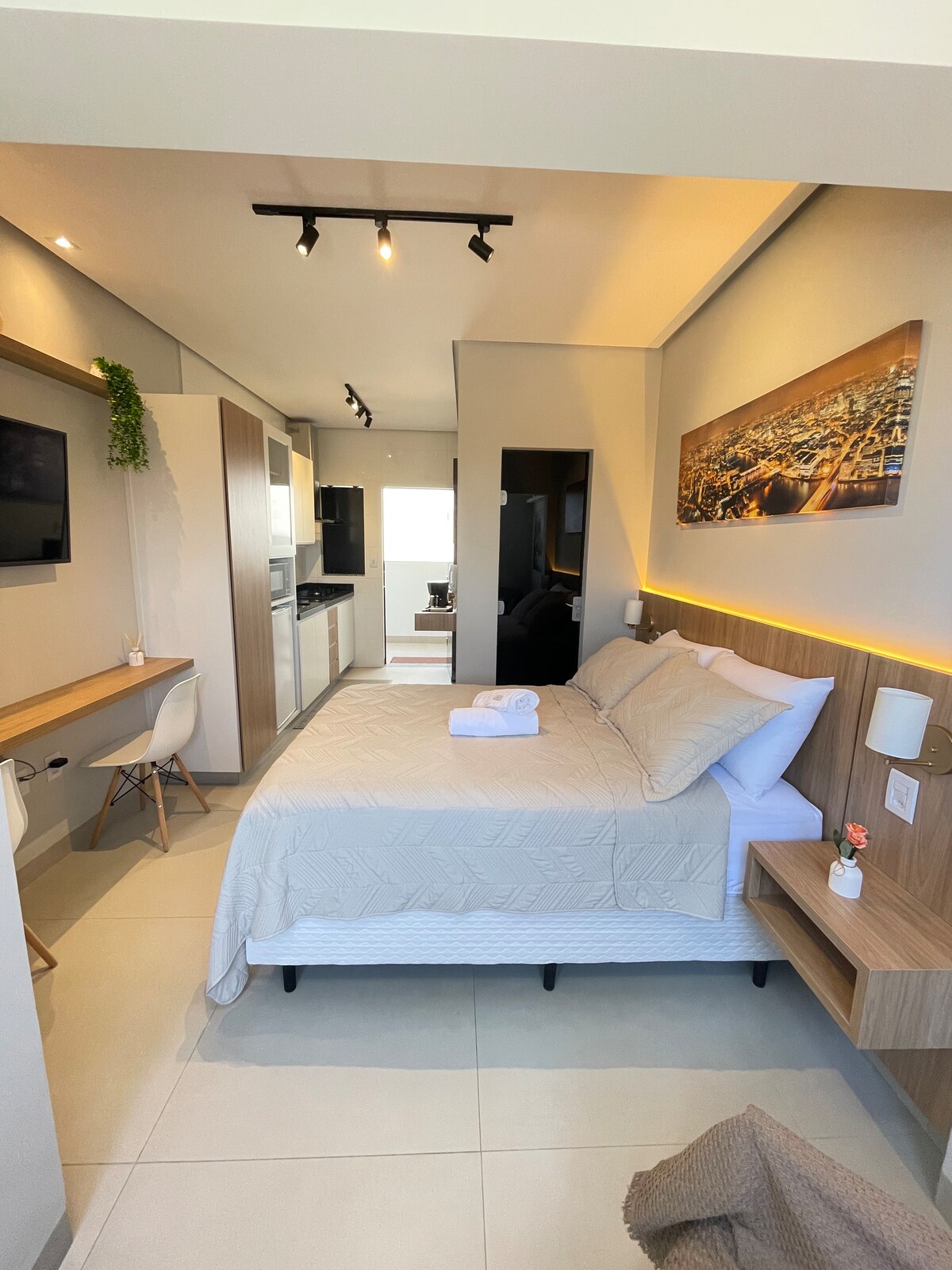 Geniet van de functionaliteit en het comfort in onze moderne studio, ideaal voor je zakenreis, romantische avonden of vrijetijdsverblijf. Gelegen in Jardim Palmeiras, ben je op loopafstand van restaurants, pizzeria's en supermarkten. Het platteland was met liefde ingericht om een gastvrije en intieme sfeer te creëren. Het gezellige slaapgedeelte en zorgvuldig geselecteerde details maken deze ruimte een echte ontsnapping voor koppels.