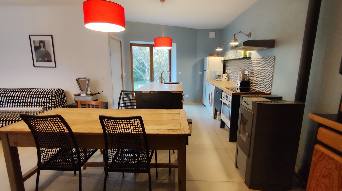 Deze woning bevindt zich in een oude gewelfde schuur, waaraan we een modernere constructie hebben toegevoegd voor de indeling van een keuken en een badkamer. We hebben geprobeerd een warme en poëtische sfeer te brengen, met behulp van een stenen en houtmix. Dankzij grote glazen deuren is dit appartement licht. Op twintig minuten lopen bent u in de zomer een waterlichaam (in de zomer). Talrijke wandelingen of fietsen.