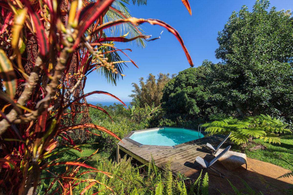 Cette maison à étage offre une chambre au rez-de-chaussée et deux chambres à l'étage, dont une avec une vue mer. Simple, confortable et pensée pour profiter du calme, elle s'étend sur un terrain arboré avec piscine et barbecue. La terrasse offre un panorama sur l'océan et des couchers de soleil magnifiques. Ici, la tranquillité est au rendez-vous : nuits fraîches, étoilées...Et selon la saison, des litchis et des endormis se glissent dans le jardin !
