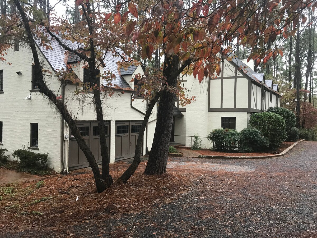 Dit Tudor Revival Carriage House ligt op slechts enkele minuten van Pinehurst en op slechts anderhalve kilometer van het centrum van Southern Pines, en houdt je dicht bij golf en activiteiten! Geniet van een rustige omgeving omringd door een hectare Longleaf Pines, Camellias en Azaleas. Geniet van een volledige keuken (koelkast, geen vriezer), eigen badkamer met bad/douche. Geniet van golfbanen in de omgeving of stop bij een bezoek aan Penick Village, het Carolina Horse Park of Ft. Vrijheid. Geen HUISDIEREN, niet ROKEN/DAMPEN binnen, geen FEESTJES.