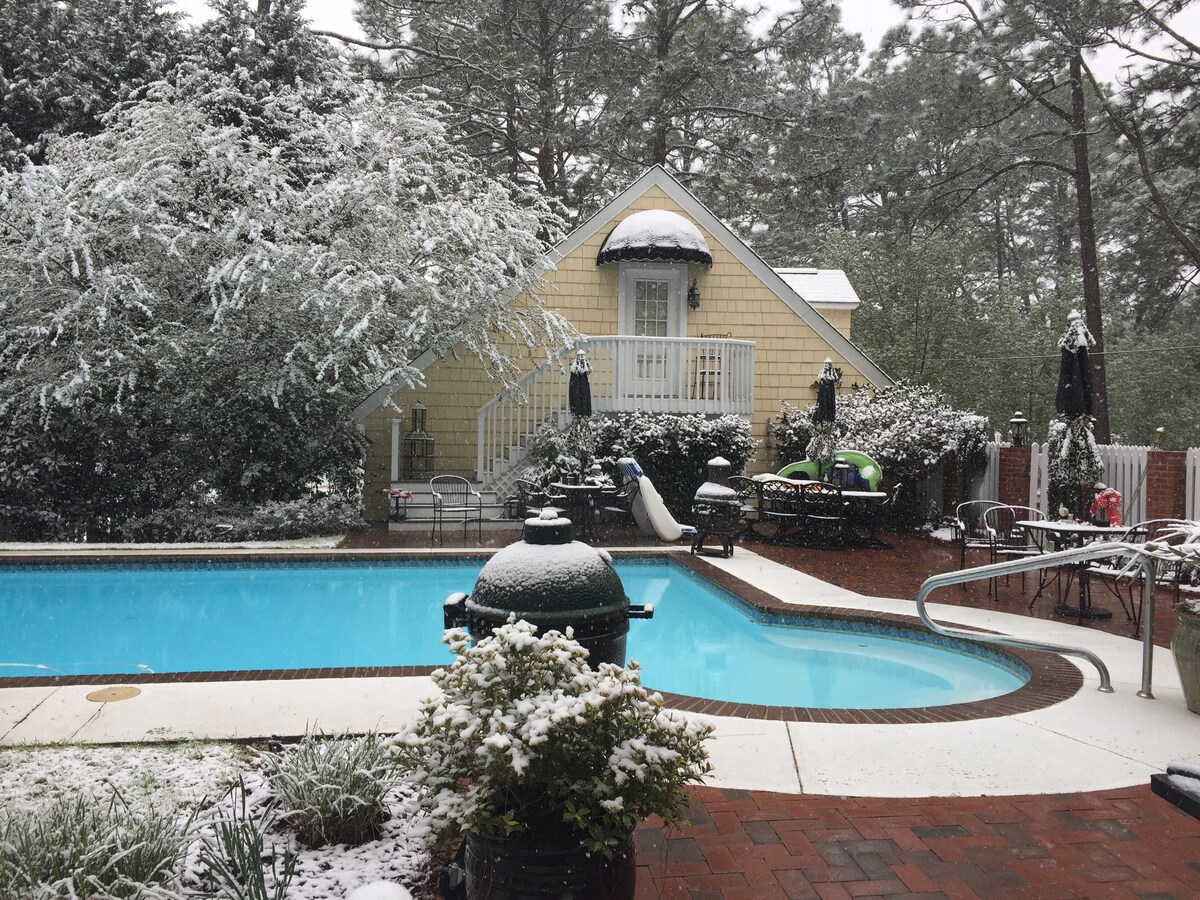 Welkom in ons rustige gastenverblijf in Southern Pines, NC! Dit eigentijdse toevluchtsoord biedt een serene ontsnapping met een zwembad, een charmant prieel en een prachtig uitzicht op de golfbaan Pine Needles. De ruime unit is ingericht in een moderne stijl en biedt een comfortabele en uitnodigende sfeer. Ontspan aan het zwembad of wandel door het goed onderhouden terrein. Golfliefhebbers zullen genieten van de nabijheid van de beroemde baan. Ontdek rust en luxe in deze verborgen parel.