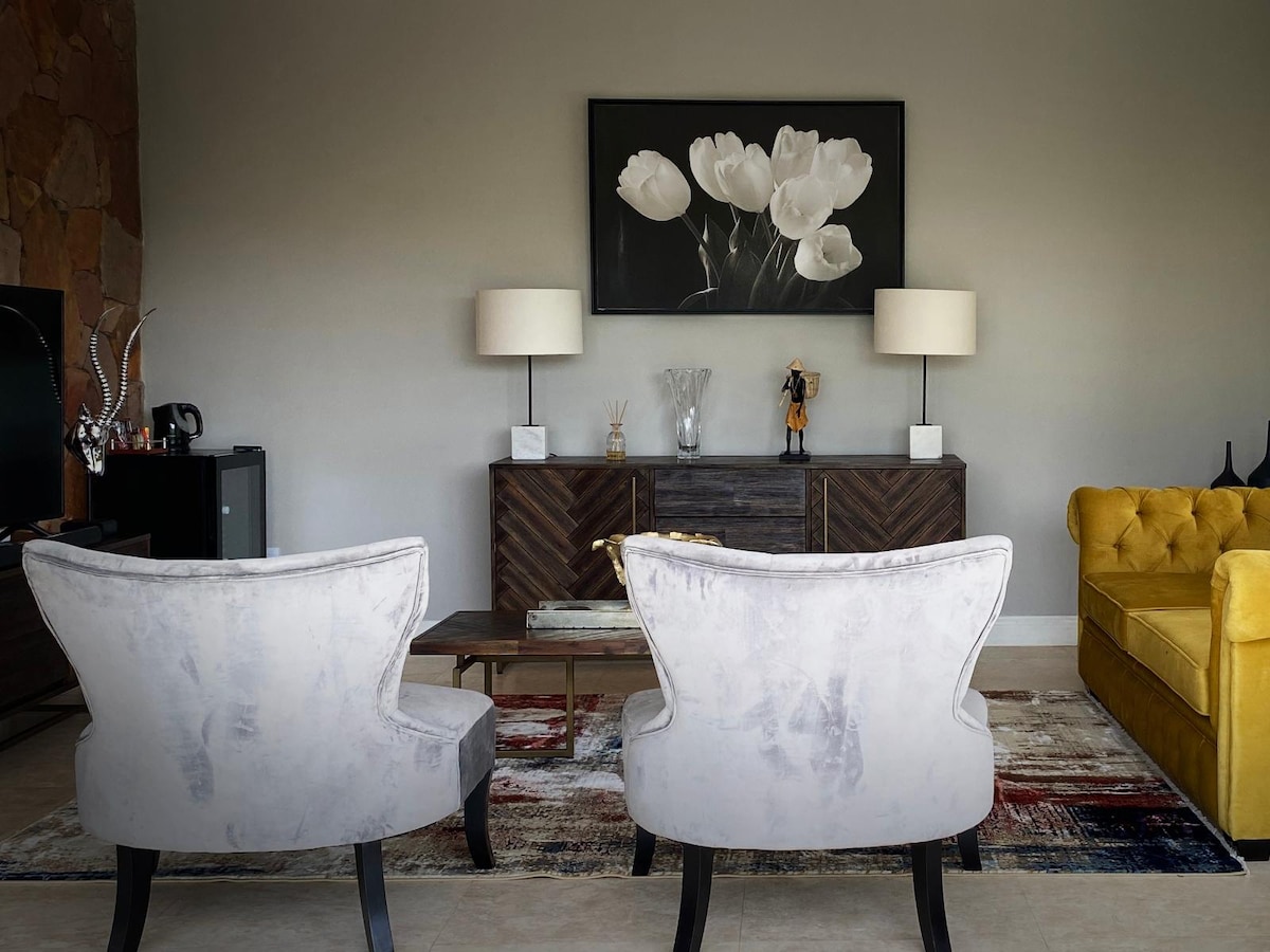 Deze unit is geschikt voor 4 personen, heeft twee slaapkamers, elk met eigen badkamer. Deze unit heeft een volledig uitgeruste keuken en een gevulde koelkast voor het gemak van de gasten en in rekening gebracht tegen extra kosten indien gebruikt.