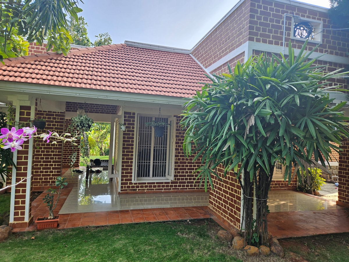 Heb je een RUSTIGE pauze nodig, van de drukte van het stadsleven? Zoek niet verder. Kom nestelen in het midden van het groen van de fruitboomgaard. Geniet van de frisse bries in de gazons. Kom hier om gewoon te ontspannen, niets te doen... Lees een boek, drink wijn, steek kampvuur aan, kijk naar verschillende vogels... Zo niet, doe niets, ontspan gewoon.. Duurzaam gebouwd hoog dak houdt het huis altijd koel. Gelegen in de omheinde boerderijgemeenschap "Nature Senses", veiligheid voor jezelf en huisdieren zijn verzekerd. WELKOM