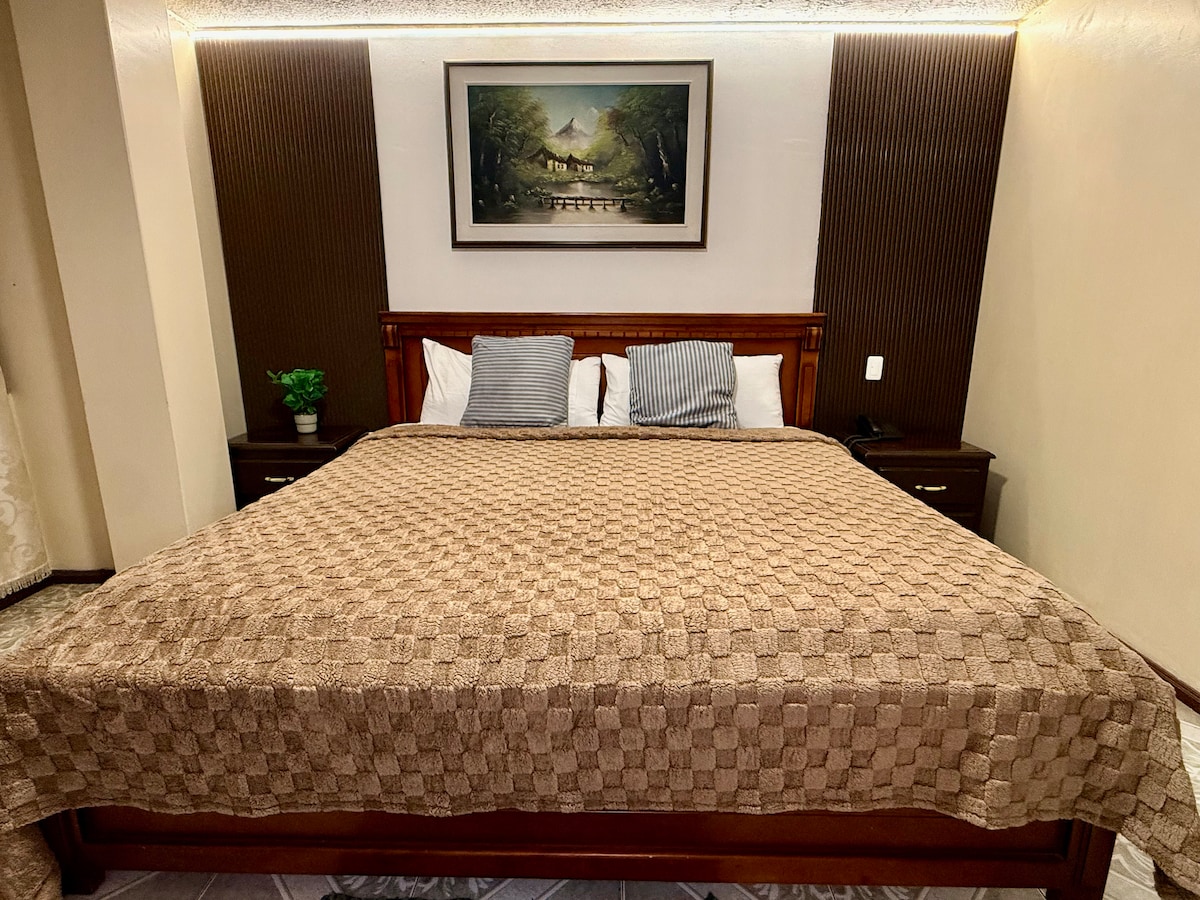 Disfruta de una habitación cómoda y acogedora con decoración moderna, perfecta para parejas o viajeros que buscan descanso y privacidad en Riobamba. Cuenta con baño privado con tina, ideal para relajarte y disfrutar de una experiencia especial, además de Smart TV con Netflix para ver tus películas y series favoritas. El hospedaje incluye garaje y está ubicado en una de las mejores zonas de Riobamba, cerca de excelentes restaurantes, bancos, oficinas y con fácil acceso al transporte.