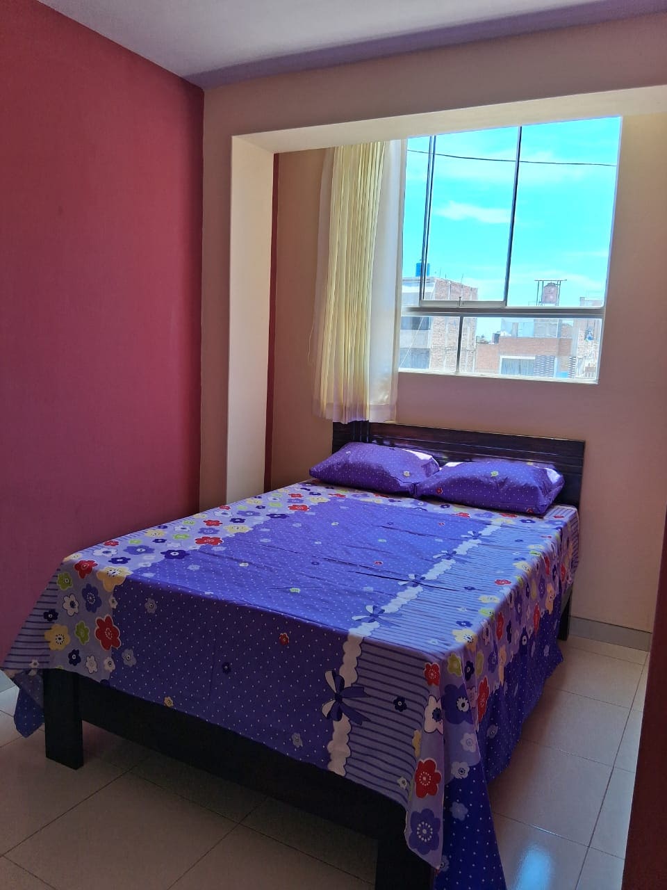 Appartement gelegen in urbanisatie Latina, achter een park, 3 blokken van de natie bank, SUNARP, BBVA en 5 minuten van de luchthaven en het winkelcentrum Real Plaza. Het appartement heeft 2 slaapkamers, de belangrijkste met een 2-plaza bed en een kleine kleedkamer, beide goed geventileerde kamers. Uitgeruste keuken, tv, wasmachine, magnetron en koelkast. Handdoeken en linnengoed zijn voorzien. Gelegen op 1 verdieping, ingang en zelf uitchecken, geen tijdsbeperkingen.