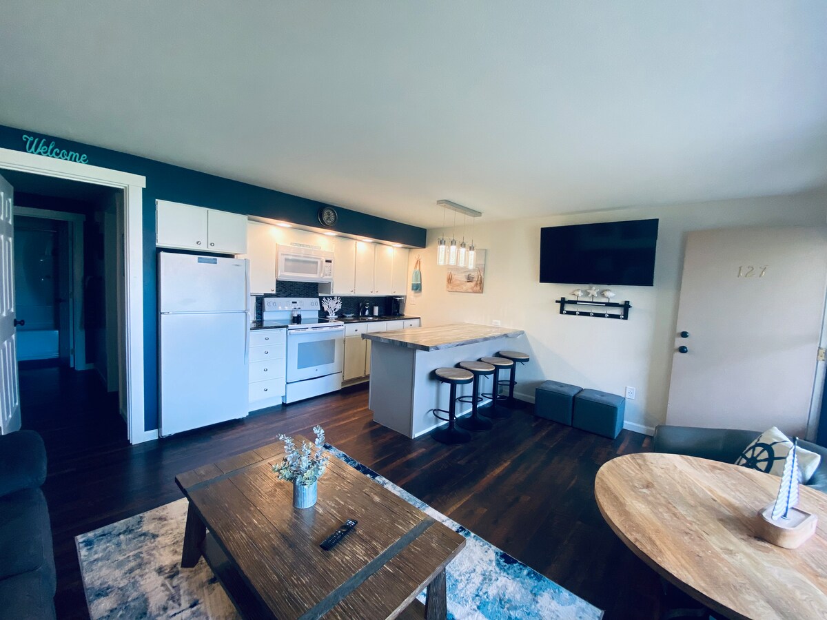 Dit appartement is onlangs gerenoveerd (gloednieuwe hardhouten vloeren, aanrechtbladen, meubels en tv) en perfect voor een gezin dat op zoek is naar een comfortabele plek om hun vakantie door te brengen. 1 Slaapkamer 1 Badkamer Maximaal 6 personen (2 kinderen) Master - 1 Queen gang - 1 stapelbed (alleen voor kleine kinderen) Woonkamer - 1 slaapbank Patio magnetron, koffiepot, broodrooster, tv 's (2) met basiskabel, gasgrill, snelle wifi en ontspan in deze rustige, stijlvolle ruimte.