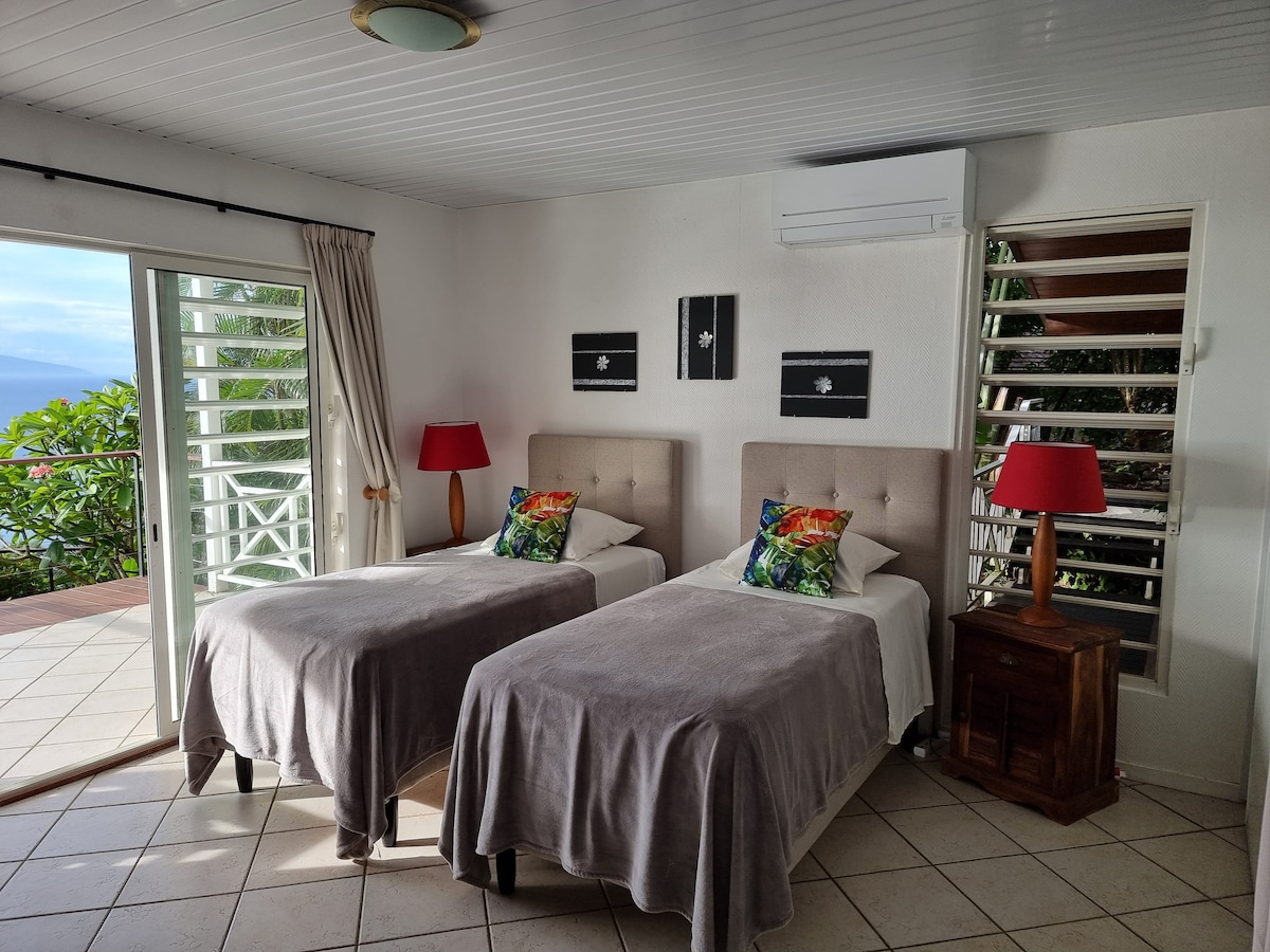Welkom, Atiha Blue Lodge is geschikt voor 2 volwassen + 1 kind. De lodge is gunstig gelegen aan zee. Het brede terras biedt een prachtig uitzicht op de rustige Atiha Bay en geeft directe toegang tot een klein grijs zandstrand: kajakken of surfen aan de overkant van de straat. Het heeft: hoofdslaapkamer met zeezicht, tussenverdieping van de 2e slaapkamer, moderne doucheruimte, uitgeruste kitchenette, groot terras met eettafel, tuinmeubilair en ligstoelen. Kajak, BBQ en fietsen op aanvraag. Tot ziens